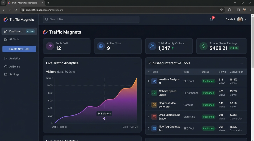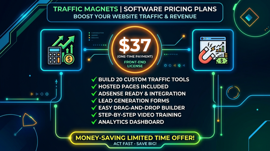 Traffic Magnets lets you build simple interactive tools — think calculators, generators, and widgets — that people actually search for on Google. The promise is you publish these things and they pull in buyer traffic on autopilot, no ads and no complicated SEO grinding required.